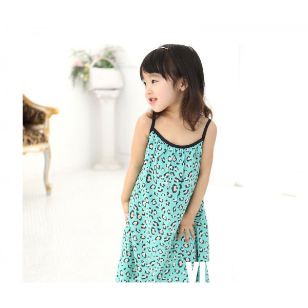 【夏季海灘公主風】韓版時尚兒童沙灘裙/細肩帶連身裙/綠色豹紋連身裙